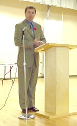 Kenneth leads the audience in O Canada, accompanied by Ila Hagen on the piano.
