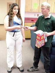 Victoria, a Grade 8 student, is thrilled to receive a free chocolate bar.