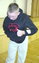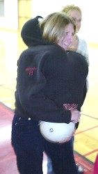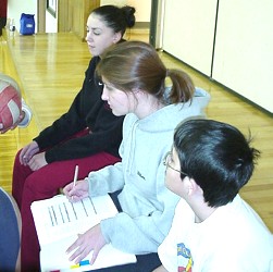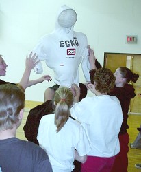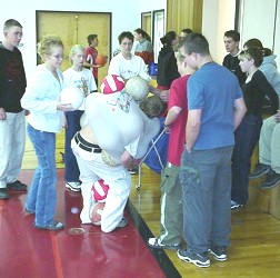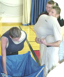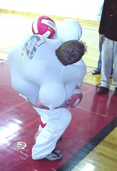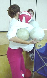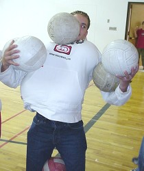 ![]() O.K., we didn't understand this activity right away. What would YOU think if you wandered into the gym and saw a bunch of people stuffing volleyballs up their shirts?! And down their pants?! Then we discovered that it was the first round of 'Worsley's Wildest Feats', and that they were trying to be the person to carry, hold, or support the largest number of volleyballs on their body or in their clothing. Judges watched each attempt closely. We quickly realized something important. There were amateurs in this sport, ... and then there were the professionals... The Amateurs: They tried. They really did. But they weren't able to squeeze in more than five or six volleyballs. The Professionals: These guys knew how to stuff a volleyball. First Cody managed fifteen. Then David surpassed that with an amazing twenty-one. After that, we lost track ... all we know for sure is that they ran out of volleyballs ...