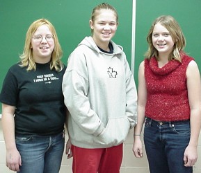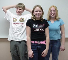 Our annual Integer Wars competition was held in the grade 7/8/9 math classroom again this year. Students competed against each other, and against the clock, to achieve the best possible result when doing integer operations mentally. A sample question might look like this: - 6 - - 2. A typical match would pit two students against each other on the computer, with ten questions each, and 100 seconds to answer them. A student's score was the number of seconds left after answering all ten questions, with a mistake costing a 10 second penalty. Typically, the winners' scores were in the 90 percent range, which meant they were answering questions at a rate of at least one per second, with no errors. The contest was set up as a tournament, with seven rounds; the final round saw just three students remaining out of the 28 in the class. These students played a final round to determine first, second, and third place. The three finalists: Nic (Gr. 9) Holly (Gr. 7) and Janine (Gr. 8) First place went to Holly in Grade 7 This year we also set up an Integer Wars tournament for all the winners from the last few years: Nic Highest Gr.9 (2002) Janine Highest Gr.8 (2002) Holly (2002 Winner) We weren't sure what would happen, but expected that the senior high students would probably walk away winners. Here's what really happened ... After the first round, the three remaining competitors were Janine, Sheena, and Holly. In the final round, Holly, a Grade 7 student, emerged as the Integer Wars Champion for Worsley School for 2002.