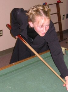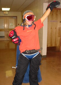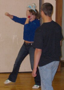 Here we have Kristi as the Ninja Bunny, practicing karate chops with her eyes closed.