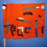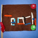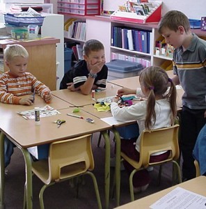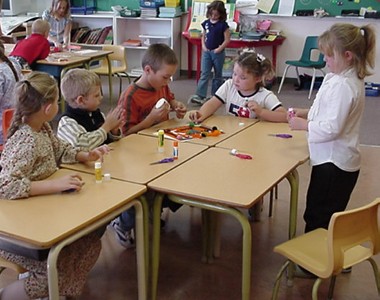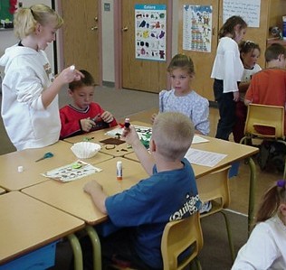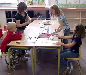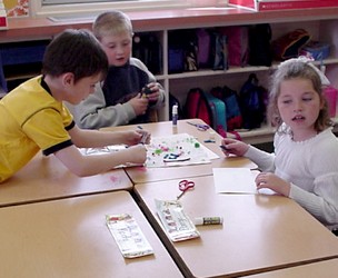 The Grade 1 and 2 students were making 'school flags' in these photos. The flags became part of a colourful bulletin board display telling us that in school we teach, learn, and do sports.