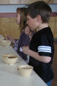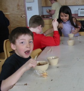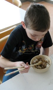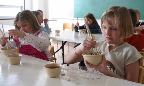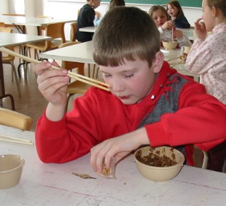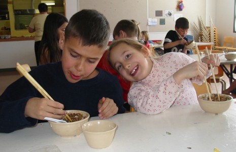 To mark the end of their studies on China, the Grade 1/2 class enjoyed a Chinese meal. The Grade 3 class helped prepare the food, and assisted the Grade 1/2 students with using chopsticks. Everyone thoroughly enjoyed the meal.