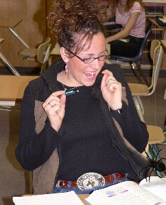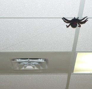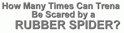 We had a rubber spider suspended from the ceiling for Hallowe'en, and somehow it never got taken down. It wasn't long before we noticed that every time the spider was lowered, it scared Trena. We decided to make a Guinness Book of World Records attempt for 'the most number of days in a row a person can be scared by a rubber spider'. Every day, just before 9am, the spider was lowered. Every day Trena jumped and screamed. (Apparently her short term memory doesn't function too well early in the morning). We made it to 14 days before she remembered 'It's just rubber!'; after that we couldn't fool her any more. The Guinness Book people told us that we weren't even close to a world record; a farmer in Texas was scared for 363 days in a row by a plastic Elvis head he had previously placed on his dashboard and subsequently forgotten about.