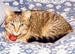 In my life I've had a lot of cats ... a lot! Some of then werr fluffy, tiger, cotton, jed and lots more. I was sometimes mean to my cats when I was little ... I know because I've seen pictures and home videos. I used to pick cats up by their two front legs or hold them like a baby with their legs all up. I used to dress up my cats in my doll clothes or feed them with a fork. I would make beds for them from cardboard boxes and fill them with blankets. When it came to animals, cats especially, I was very kind and compassionate. Sometimes I wish I could be that gentle and kind with people. I remember one time one of our kittens hurt its leg and couldn't walk, so my sister Michelle, my brother Benny and I made a splint for it and let it sleep in a box we made ... and in a week in could walk again. I have many memories of cats and kittens. I am so crazy about cats that one time my friend Emily and I redid my whole room and made it a cat room. My desk had a cat can on it. We sewed a cat out of material and laid it on my bed. We covered my walls with cat posters. I was cat crazy ... and I still am, only I now have a just a few cat pictures. I practice drawing them. Now we have a cat named Bob; he's the best cat ever. He's lazy inside, but active outside. If I am ever sad I just go to Bob and he always makes me smile. Bob is striped, and looks a lot like the cat below, only he doesn't have a collar.