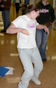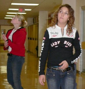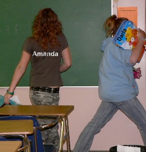 Amanda uses the 'walking sideways' technique, while Darla shelters behind a book.