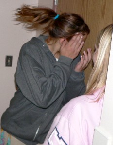 Kelsey pretends to throw up all over Destiny. She can't fool us!