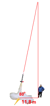 In order to calculate the height that one of our rockets reached, we examined the flight path of several rockets to see what they were doing. They were being launched at an angle slightly off vertical. We noticed that the rockets seemed to climb at a steep angle, following a fairly straight path, until the motor burned out, at which point the rocket began to drift. In order to calculate the height the rocket reached up to the point of burn-out, we needed to locate a position on the ground directly under the burn-out point. Mr. Phelps positioned himself at this location, and we measured the distance from the launching point to be about 11.8 metres. We also measured the angle that the rocket left the launch pad with a large protractor; this angle turned out to be about 80°.