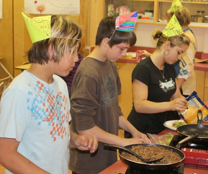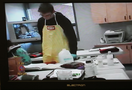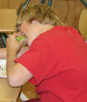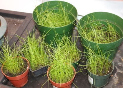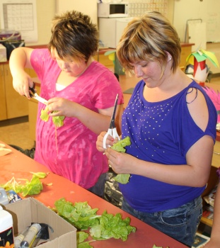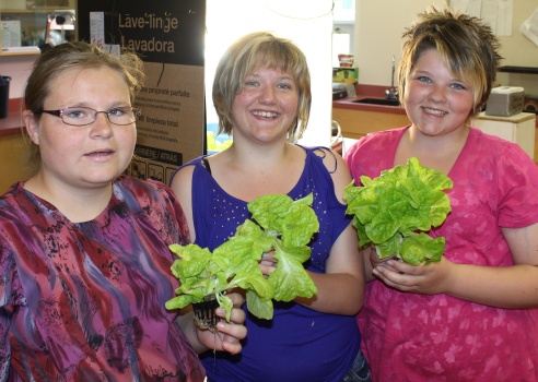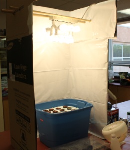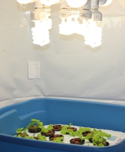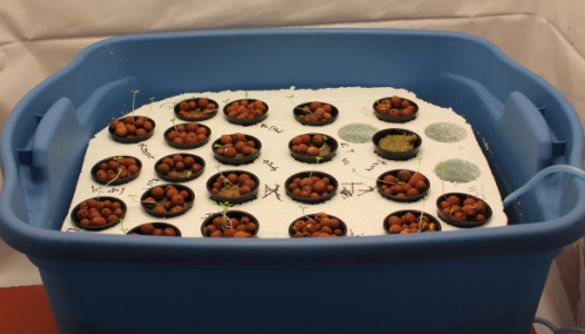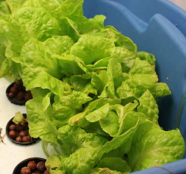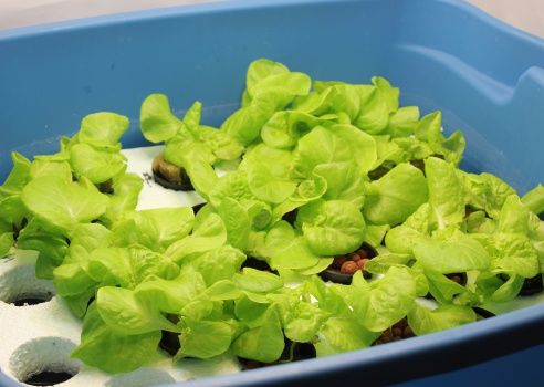A simple hydroponic reservoir containing an air stone and nutrient solution allows many lettuce plants to grow without the mess and smell made by soil.