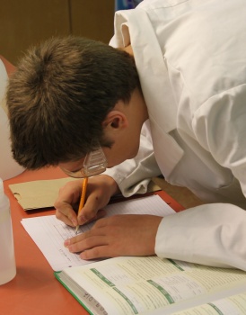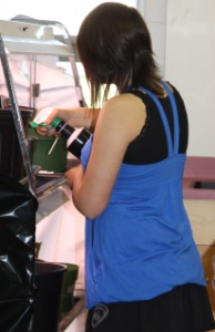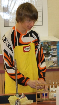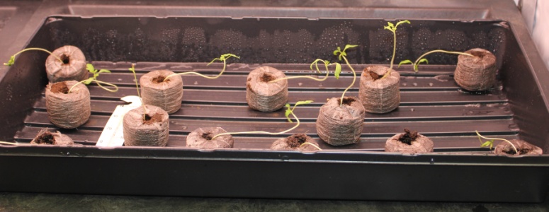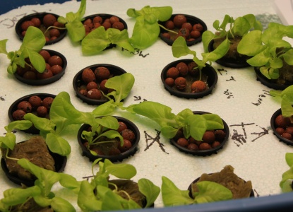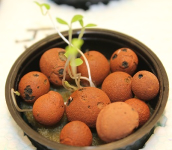 A small net cup is used to house a germinating lettuce plant. The lettuce seed was germinated in rock wool and covered in expanded clay balls, which help retain moisture for the lettuce roots when they develop.