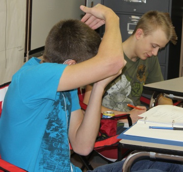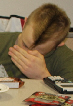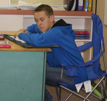 More pretending to work. Danny tried to hide under his hood, but we were faster than he was! (Notice the hard-working teacher in the background who is not avoiding the camera! Wait a minute ... who took this picture??)