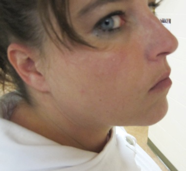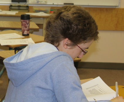 Michelle hopes we won't take her picture, by pretending to work. Oh, wait a minute ... she IS working!