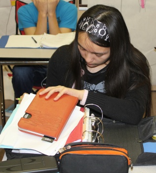 Emily is pretending to look for her agenda. Oops ... there it is right on top!