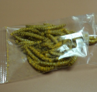 Crispy barbecue-flavoured mealworms. They just pretended to eat them. No sense of adventure at all. Mr. Willis, on the other hand, ate three of them. Urp.