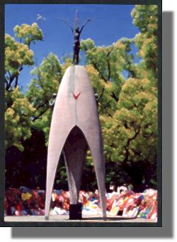 | One of the most popular monuments in Peace Memorial Park is the Children's Peace Monument, also known as the Tower of the Paper Cranes. This monument was inspired by Sadako Sasaki, a vivacious young girl struck down by radiation aftereffects. Sadako, two at the time of the bombing, was one of many children who developed leukemia about ten years later. In the hospital she folded over a thousand paper cranes using medicine wrapping paper in the hope that doing so would cure her. She and her classmates continued bravely folding the cranes until the day she died-October 25, 1955. Sadako's grieving classmates decided to build a monument in her honor. Their sincere passion led to a nationwide fundraising campaign to build a monument for her and the thousands of other children lost to the atomic bombing. With contributions from all over Japan, the monument was built and unveiled on May 5, 1958. On top of the concrete tower stands the bronze statue of a young girl holding over her head a huge paper crane symbolizing the hope of all children for a peaceful future. |