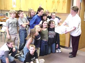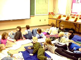 The Grade 3/4 class takes the afternoon off to watch a movie ... having won the Education Week school spirit cheer contest! |
