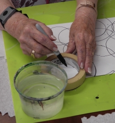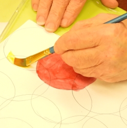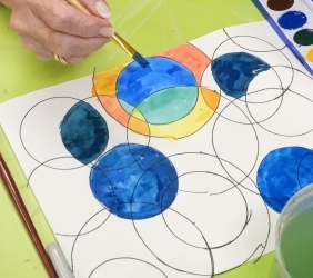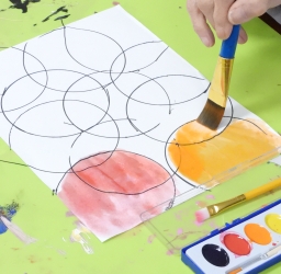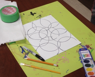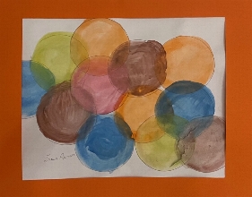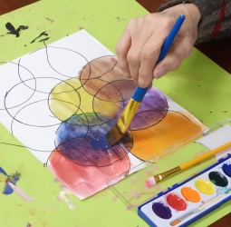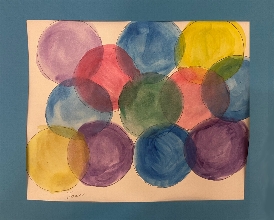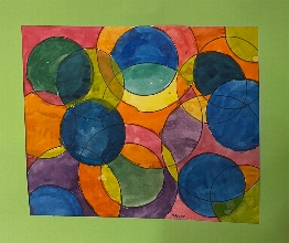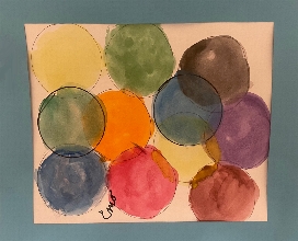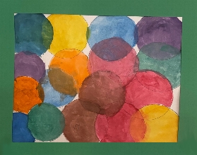 ![]() The next step is to paint each circle with a thin coat of watercolour paint. Let each dry before beginning another; you can add a second coat to make each circle darker if you choose. Try to paint overlapping circles in different colours. The regions where circles overlap will make new colours (blue and yellow make green, for instance).