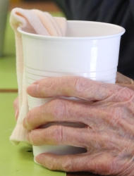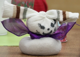 ![]() ![]() You'll need a sock (preferably clean, but if you're making skunks, used unwashed ones might be a creative embellishment). You'll also want lots of rice, some small elastics, markers, ribbons, and large plastic cups. You might also need some fast-drying glue. ![]() ![]() There are various ways of getting the rice into the sock without making a mess; one way might be to have students work in pairs and use a funnel. We chose to stuff the sock into the bottom of a plastic cup and peel the top of the sock back over the rim of the cup, as our instructor is demonstrating at the right. Then you can pour the rice right into the sock. Wrap it tightly with an elastic, right above the body. ![]() ![]() Once again, you could do this with a funnel, but we chose to use the plastic cup again. Stuff the filled bottom of the sock into the cup, and peel the top of the sock sock back over the cup rim. Now you can pour rice directly into the sock. Remember: less than last time! ![]() ![]() If you used an elastic here that was too big or wide and it shows, don't worry ... the ribbon will hide that. Some people chose not to tie an elastic above the head, but tied the ears instead. We'll show that below. By the way, if you're making a bear or skunk, you can disguise the elastics by painting them with a dark brown or black permanent marker. If your animal is like a skunk and has a big tail, you could reverse what we've done so far, by making the first ball smaller than the second. Then the left-over piece of sock will become the tail! ![]() For a bear, don't do that. Instead, cut off most of the sock above the elastic; just leave enough to fold back onto the head. Glue it in place. Then pull out and away from the rice two small sections of sock on either side of the head, and tie them off with small elastics. Ears! If the left-over sock is a tail, don't cut it at all; instead, stuff it with something soft like cotton balls and sew up the end. Use your imagination. ![]() ![]() Now add some eyes and a nose with a marker. If you can find a corn broom, remove a few strands and stick them beside the nose as whiskers. Have a look at some finished bunnies below. ![]() ![]() ![]() ![]()