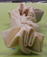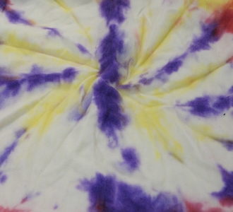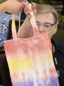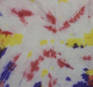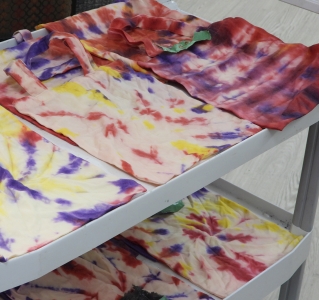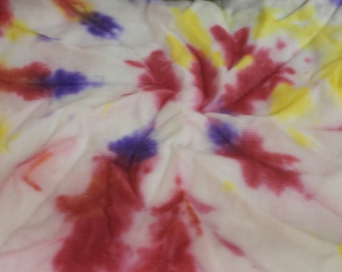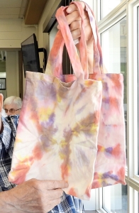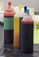 Tie Dye art is one of those art projects that anyone can do, and that almost always produces beautiful results. We'll be tie dyeing some simple and inexpensive cloth bags.The materials used, in addition to bags and table coverings, are disposable gloves, aprons, elastic bands, and RIT fabric dye. The dye was transferred to squirt bottles to make it easy to apply. RIT dye stains clothing, skin and the floor; care is needed. Experiment first to make sure you can clean the inevitable drips off the floor. The bags are prepared in advance in two different styles. One style is an accordian fold, producing a rectangular shape tied with about four elastic bands. Another style is to take one of these rectangular accordion-folded shapes and roll it into a circle, securing it with more elastics. ![]() ![]()