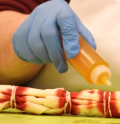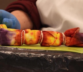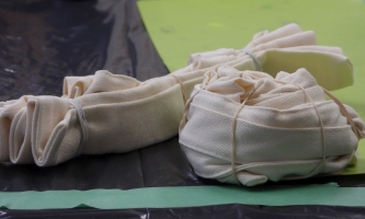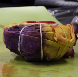 The first step is to wet the tied cloth bags enough to dampen but not soak them. Then you can start applying the dye. Here are some suggestions: