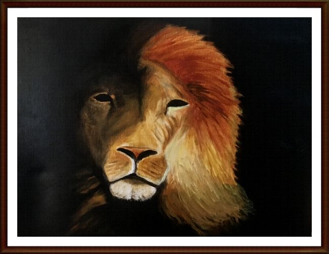 The lion rises, listening intently ...
