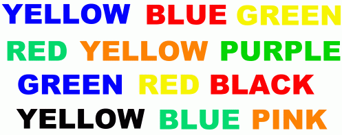 but say the colour you see, not the word. Start by saying 'BLUE' ... ![]() Difficult, wasn't it? That's because the right half of your brain is trying to say the colour, while the left side of your brain is trying to say the word. You get confused because your brain is trying to do both things at once. |