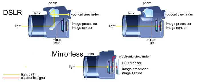 - Mirrorless cameras tend to be smaller and lighter, because there is no prism, mirror or mirror-moving mechanism