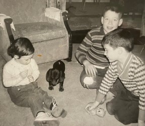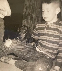 When my brother and I were kids, not long after my sister was born, my father bought us a dog. He ordered it from a breeder in southern Ontario, and it arrived one day by train in a small cage. It was a dachshund, a 'weiner dog', and we all loved him at first sight. We called him Fritz. There's no cuter dog than a Dachshund puppy!Fritz was a black and tan dachshund. The breed was originally developed in Germany where it was bred to scent, chase, and flush out badgers and other burrow-dwelling animals. ![]() ![]() That's me on the right, at about age 9 We only had Fritz for a couple of years, but during that time he made an impression on all of us. He loved being outside with people. When we went on trips to the lake, he was excited to be in the car with the window half-rolled down, and we discovered that he loved to swim. However, things began to go wrong from the start. When we would let him out to pee, Fritz would run around the house, around and around, dribbling pee as he went. Within a week there was a path worn in the grass where he was running. When we would take Fritz for walks, he was paralyzed with fear whenever we would meet another dog. He would lie down on his back as if preparing to be eaten! In hidsight, I suspect the breeder we'd gotten Fritz from was probably a 'puppy mill' operation, and that Fritz was likely severely inbred. But we didn't know that then. Fritz did like hot dogs, and barbecue days outside were his favourite times. He was also a very loving dog; I don't remember him ever biting any of us, although he wasn't a fan of the scruffy neighbourhood cat that used to hang around our place. We loved him to pieces. My brother Don and Fritz had a special affinity. The short video snippet above is from my father's home movie collection, which many years ago my sister had converted to digital format. Fritz loved being with us in the yard. My father bought Fritz a small German cross to hang on his collar. Being a dachshund, it tended to drag on the floor a lot. However, Fritz's sometimes erratic behaviour continued. He would bark occasionally at walls, for no apparent reason. The pee path around our house, which he never, ever deviated from when alone, got deeper. Neighbours commented on it. One day when Fritz was outside on his pee run, he disappeared. He was missing for many weeks, and we all assumed that he'd been grabbed by another dog and was dead. But one day a neighbour living nearby in the lane behind our place called and asked if we were missing a dog. He said that there was an emaciated dachshund in his shed, and he couldn't get near it because it would growl menacingly. My father decided to let my brother Don go with him to have a look, since Fritz had absolutely doted on my brother. They returned shortly with the dog that was indeed Fritz. He was emaciated, scared, and his paws were worn and bloody. While he was at the veterinarian recuperating, we surmised that someone driving by must have seen him in the front yard and stopped, opening a door to let him jump in. Fritz did love to ride in cars, and wouldn't have turned down an offer like that! Days later, wherever the person had taken him, he must have escaped and headed home, walking many, many miles. How he was able to do that we never figured out. We loved him even more after that. But he was never the same, in temperament or health. He growled a lot ... although never at Don. He was generally sickly. He refused to go on walks. When we left for our summer vacation down south, and dropped him off at the vet as we had done the previous summer, my father made the request to have him put down. Without telling us. When we got back and my father told us what he had done, my brother, sister and I were very angry, since we hadn't had a chance to say goodbye to Fritz. I remember my resentment continued for a long time. |