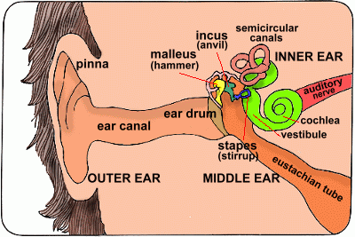 ![]() ![]() You can actually see the effect of sound vibrations with an easy experiment. Get a bowl and cover the top with plastic sandwich wrap. Pull the plastic tight across the top in all directions until it is flat and smooth; tape it tight if necessary. Then sprinkle some salt onto the plastic. Now get a pot and spoon; hold them near the bowl and hit the bottom of the pot hard with the spoon. You should see the salt jump on the plastic. Try yelling loudly next to the bowl, and you may be able to make the salt jump using the vibrations from your voice. The loud noise you make is a vibration, which is transmitted through the air, to your ear and also to the plastic. The plastic vibrates, and makes the salt crystals jump! Let's examine how sounds from a vibrating object turn into sound you hear. ![]() When something vibrates, it moves back and forth. A vibrating object could be a speaker on a CD player, or your vocal cords, or the string on a guitar. As the object vibrates, it pushes the air molecules next to it closer together, in patterns corresponding to the movements of the object. These patterns of compressed air molecules bump into the ones next to them, passing on the pattern. In this way the original pattern of vibrations is sent through the air, as molecules continue to bump into their neighbours. Because the vibrations must push against something to send the pattern onwards, sound vibrations must travel through something in order to be heard. Sound will travel through air, and even faster through liquids and solids (where the particles are closer together). But sound can't travel where there are no particles ... so sound can't travel in a vacuum. There are no sounds in outer space, or on the moon! Sound waves are longitudinal waves because particles of the substance through which the sound passes vibrate in the same direction as the direction in which the sound moves. ![]() How Sound is Heard: The pattern of compressed air molecules eventually bumps into the air molecules inside your ear, next to your eardrum. When these in turn bump into the eardrum itself, they cause it to vibrate with the same pattern. The sound pattern that was originally caused by a vibrating object has now made its way into your head. Let's look at what happens next! ![]() These bones act as levers, magnifying the sound energy up to 15 times. The stirrup bone (stapes) sends the sound pulses through a window in the vestibule, the upper region of the cochlea. This snail-shaped organ in the inner ear contains fluid, and its inner surface is lined with over 20,000 hair-like nerve cells. Different hairs are sensitive to particular frequencies of sound; as the energy pulses pass through the fluid and past the hairs, they vibrate with their particular frequency and send an electrical pulse along the auditory nerve, to the brain. The brain recognizes these electrical signals as sound. Other Parts of the Ear: The middle ear is a cavity which is filled with air, and is is connected by the Eustachian tube to the throat. This connection allows you to equalize the pressure in various parts of the ear. When this tube becomes clogged (when you have a cold), the ear cavity is unable to equalize the pressure; this often leads to earaches. The semicircular canals, like the cochlea, are also filled with a water-like fluid. This fluid, as it sloshes back and forth across nerve cells inside the semicircular canals, acts like an accelerometer; it helps you keep track of how your body is moving, and helps you maintain your balance. How Loud are Sounds? Sound levels are measured in decibels (dB), which are a logarithmic measure of the loudness of a sound. The quietest sound that we can actually hear is about zero decibels. The loudest sounds we hear (without pain) are about 120 dB. The loudest sounds we can hear without causing us pain have about one million times more energy than the quietest sounds we can hear. Most sounds we hear are in the range of 30 to 100 dB. Here is a table showing the decibel level of some common sounds: