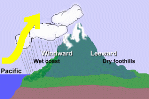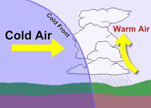 Weather can change quickly, and it is due to the movement of air masses in the atmosphere. An air mass is a large chunk of air ... often many tens of miles wide ... that shares the same temperature and humidity. When two different air masses meet, the boundary between them is called a front, and bad weather is usually the result. The principle that causes storms is a simple one ... when air rises, it expands and cools. Cooling occurs at the rate of about 10°C per kilometre. The water vapour in the air soon condenses into water droplets, which form clouds, and eventually these droplets fall from the sky as rain. Storms can occur when two very different air masses meet. Let's look at two possibilities. ![]() ![]() This happens when a fast-moving mass of cold air hits a warm air mass. The warm air, which holds a lot of water vapour, gets pushed upward. The water vapour condenses to water droplets, which form tall clouds. Eventually the weight of the drops can no longer be supported by the air, and they fall. This type of storm is often violent, with a lot of thunder and lightning, and heavy rain in a short period of time. But it ends quickly. ![]() A warm front happens when a fast moving mass of warm air encounters a cold air mass, and rides up on top of it. The warm, humid air eventually rises high enough for water droplets and clouds to form, and rain to fall. This type of storm usually covers more area, lasts longer, and will produce a steady rain for a long period of time. Thunder and lightning often accompany the storm , but of a less violent nature than in a cold front. ![]() You can see this effect in the Rocky Mountains. The wind come from the west, where it has picked up a lot of moisture from the Pacific Ocean. As it rises over the Rockies, water vapour condenses and falls as rain. The west side of the Rockies gets a lot of rain. By the time the winds reach the far side, they're dry ... the foothills there get very little rain. Air Pressure You probably know that a barometer measures air pressure, and can tell you something about what the weather is going to be like. Rising air pressure means good weather is coming, and dropping air pressure means that bad weather is on the way. Here's the explanation. Air masses are constantly moving. In some places air is going up; in other places it is falling. In between, air is moving parallel to the surface ... causing winds. When you are experiencing low pressure, it usually means that air above you is rising, and expanding. This rising, expanding air will cool, forcing its water vapour to condense, clouds to form, and maybe rain to fall. If you are experiencing high pressure, it probably means that the air above you is falling, and compressing. As this air falls, it gets warmer. This means it can hold more water vapour, so any clouds that exist will evaporate, leaving a clear sky. |