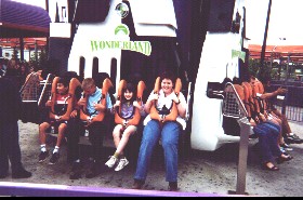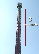 ![]() I don't uderstand why anyone would want to do this. Then the brakes fail, and your chair plummets downwards in free-fall. A second or so before you are about to become a layer of jelly on the pavement below, the chairs come to an abrupt but smooth stop. We have some old pictures of Jesse and Emily on this ride, so we though we'd look at the equations of motion for falling bodies, as studied in Physics 20. Notice especially the look of rapt anticipation on the faces of the riders. Needless to say, the expressions after the ride was over were considerably different. (The words 'white' and 'sheet' come to mind). We weren't allowed to show you that picture. Anyway, the tower is 29 stories tall, which makes it close to 290 feet tall, or about 88 metres or so. The main formula used for falling objects is the following: ![]() d is the downward distance of feefall vi is the initial downwards speed, which is 0 m/s, so the formula can be rewritten: ![]() g is the acceleration due to gravity, which is 9.8 m/s2 downwards. We have an approximate value for t, the time of freefall; we estimated 3 seconds. This means we can work out how far the seats fell: ![]() In other words, the ride lets you fall a distance of only about half of the tower's height. The rest of the distance is made up by the supporting mechanism at the top (you aren't quite the full 290 feet up when at the top ... maybe only 250), as well as the distance required to brake, bringing you gently to a stop. Nevertheless, the experience of falling is very real, ... especially if you manage to do it with your eyes open! |