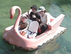 ![]() Just why do those swans float, anyway? They must weigh a thousand pounds, for heaven's sake! Not to mention all those people sitting in them. The secret is in making sure the density of the boat and passengers is less than the density of water, which is 1 gram per cubic centimetre. Any substance immersed in water that has a density less than this will experience a buoyant force upwards. Density is calculated by dividing mass by volume. If the boat were made from a solid material, it might not float. But it contains a lot of styrofoam underneath, which is light (it's full of air pockets). This helps to lower its mass. The swan is still pretty heavy, though. But it has a large volume. When you divide its mass (in grams) by its volume (in cubic centimetres), the answer will be less than 1. So it will float on water. This is also the reason that large steel ships, like aircraft carriers, that weigh a gazillion tonnes, can float. They have a lot of empty space inside, and a large volume. So when you divide their large mass by their volume, you're dividing by an even larger number ... and the answer will be less than 1. So the boat floats! |