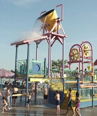 ![]() There are no motors involved; the only things touching the bucket are the axle, and the water (from two pipes) which flows into the bucket. What makes it tip over? The principle here is the bucket's centre of mass. This mathematical concept is an imaginary point that the bucket and water would shrink to, if they were reduced to a point. It's like the average centre point of all the mass ... the mass of the bucket and water is equally centred around this point. Obviously the position of this centre of mass point will change as the bucket fills. You can find a more detailed description of centre of mass, and an explanation of why things fall over, on our 'Why Are Bowling Pins Fat At The Bottom' page. To summarize: when the centre of mass is over a point that is outside the base of the object, it will fall over. In the case of our bucket of water, the 'base' is what it rests on, the axle, which is quite narrow. The bucket should tip over pretty easily, once the water gets too high inside. But it would need some sort of nudge, since it looks like the bucket is perfectly symmetric vertically; the centre of mass should get higher and higher, but should always be directly over the axle, so the bucket won't tip unless it's given a nudge. That doesn't happen. We couldn't see inside the bucket, but here is one explanation that would cause the bucket to tip as it fills, every time. The bucket might have a partition in the upper half: