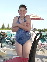 ![]() No, not the tattoo! The pool water is much cooler than the air. One would expect that when you get out of the pool, you would immediately start to feel hot again, in the bright sun and warm air. However, what actually happens is that, despite the heat, everyone who gets out of the pool immediately begins to shiver! Why would you shiver when the outside air temperature is over 90°F, or 32°C? Here's the reason. Your body is coated with a layer of water, which quickly begins to evaporate. In order for this liquid to change to a gas, it must get a lot of energy from somewhere. Gas particles have much more energy than liquid particles. Some of the energy that goes into the water particles is drawn from your skin. As the heat leaves your skin and turns the water to gas, your skin becomes cooler. As a liquid evaporates, it steals heat from the surface it was on, making that surface cooler. This is exactly the reason why you sweat. Persperation is a liquid; as it evaporates, your skin gets cooled. Find out about other ways your body can be cooled here. This process creates other problems, however. Your body uses liquids for many purposes; the main use is to transport food and oxygen around your body, using blood. Ordinarily, this liquid doesn't get lost ... it stays inside the body. But your body must use some of this water to cool itself, by sweating. It also must use some to flush out poisons, by dissolving them in water, which you then eliminate as urine. Both of these processes cause water to be lost from the body. That's why you need to continually consume more liquid. |