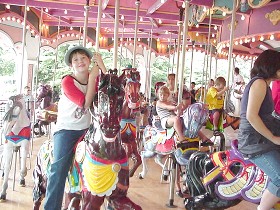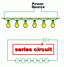 ![]() Amazingly, very few of the bulbs anywhere were burnt out ... dead ones must be replaced every day! The large arrays of light bulbs of course immediately suggested the difference between series and parallel circuits, and why all the lights on a ride don't go off if one light burns out. Let's look at the difference. ![]() Here's a simple series circuit, made from a single wire, where the electricity can flow in a complete path ... from the power source, around the wire, and back to the source. In order for this circuit to function, the path that the electicity follows must be unbroken. This means that if a single bulb burns out, the circuit will be broken, and the entire string of bulbs will go out. Clearly, a series circuit is not very useful if you have more than one object that needs electricity. When a bulb blows, you would have to test every single bulb on the circuit to find the one that is broken. ![]() Here's the way most circuits are set up. This is called a parallel circuit. You probably know that most electrical wiring is composed of a double strand of wire. This creates a complete circuit path that can follow any one of the branches, or all of them. The electricity flows through each bulb on a separate branch of the circuit. In a parallel circuit, the bubs are on separate paths, that look like rungs of a ladder. If one bulb blows, the electricity can't flow through that branch of the circuit. But it can still flow through all the other branches! The result is that a dead bulb will not cause the entire circuit to stop working, and the one bulb that isn't receiving electricity can be easily identified and replaced. |