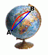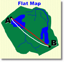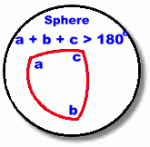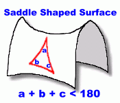 In a Triangle ![]() What do the three angles in a triangle add to? You may think you already know the answer to this question. The angles add to 180°, right? In fact, you only know part of the answer. The angles in a triangle only add to 180° sometimes! Under certain conditions they add to more than 180°, and sometimes less. Let's look at why. ![]() The situation with which you are familiar is the one where a triangle is drawn on a flat surface, called a plane. Such surfaces, like the page in your math notebook, are perfactly flat. They are described by saying they have zero curvature. Whenever you draw three straight lines to form a triangle here, the three angles formed will always add to exactly 180°. But there's no reason we have to draw the triangle on a flat surface ... ![]() Suppose instead we draw the triangle on a sphere. Using a flexible ruler, we draw three straight lines on the surface of a sphere, and then measure the angles. We discover that the sum of those three angles is greater that 180°! This is not a trick. It's difficult to show on a page like this, so we urge you to get a globe or large ball, and draw three straight lines with a ruler, that connect. Measure the angles. You will find for yourself that the angle sum exceeds 180°. This is because a sphere has positive curvature. This is a very important fact. It means, for instance, that triangular paths drawn across the surface of the earth that are long enough to follow the curvature of the earth (which is very nearly a sphere) will total more than 180°. ![]() On a flat map of a region of the earth, as shown on the right, you might assume that the shortest distance between points A and B is shown by the straight line joining them. If in fact the earth were flat, this would be true. But the earth's surface is not flat ... it is the curved surface of a sphere. The shortest distance is the arc (centred at the centre of the earth), shown in white. This is called a 'great circle', the path flown by airplanes to cover the least distance from A to B. ![]() Now locate and mark points A and B and the in-between points on a large globe, and draw the same path. You will see that this path is longer than the path directly from A to B along the surface of the globe. If you locate points along that line on the globe, and transfer them back to the flat map, you will get a curve. Is there a condition uder which the angles in a triangle add to less than 180°? ![]() Yes there is. This will happen on a surface which has negative curvature. An example is the inner curve of a saddle-shaped surface, as shown on the right. Triangles drawn on this surface will have three angles that do indeed add to less than 180°! ![]() This fact is important whenever shapes with negative curvature are constructed ... large stadium roofs, for example. |