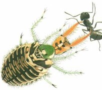 ![]() ![]() ![]() The ant lion larva eats ants and other insects. Some species hide under leaves or bits of wood, and attack passing insects. In sandy regions, some ant lion larvae dig a shallow cone-shaped pit and wait at the bottom for an insect to slip on the loose sand and fall in. When this happens, the ant lion eats the insect. These pit-digging ant lions are called "doodlebugs" in the United States because of the wandering designs they make in the sand while looking for the ideal spot to dig a pit. When it finally finds the right place, the 'doodlebug' makes circles in the sand with its head, each deeper than the last, until its pit is excavated. Then it buries itself at the bottom with only its head, with jaws open, can be seen, and waits for its prey. ![]() ![]() Digestive juices and a toxin are then injected into the prey, liquefying everything but the exoskeleton. After sucking out the insect's insides, the ant lion tosses the remains from the pit. If small objects like pebbles or bits of leaf fall into the pit, the ant lion will try to clear them away. After a rainy or windy day, the ant lion often needs to rebuild its pit. If it doesn't catch enough prey in its trap, the ant lion will abandon it and move to another location. ![]() In North America, adult ant lions are approximately 4 cm long and have a wingspan of 8 cm; fully developed larvae are as long as a human fingernail, about 1.5 cm. Antlions are a family of insects with the classification Myrmeleontidae. The name is from the Greek words 'myrmex' (ant) and 'leon' (lion). Here is the complete classification for the ant lion: