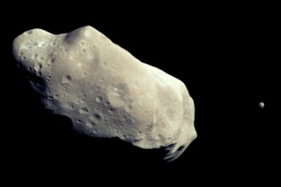 ![]() This asteroid has a moon! The robot spacecraft Galileo, while exploring the Jupiter system, photographed several asteroids. One of them, the asteroid Ida, is shown above, and it clearly has a small moon in orbit around it. Ida itself is only about 60 kilometres long; its tiny moon, named Dactyl, is a mere 1.5 kilometres across. Dactyl is the first moon of an asteroid ever discovered, although other asteroids are now known to have moons too. The Galileo spacecraft took the photo above on August 28, 1993, when it was about 10,500 kilometers from Ida. Photos and information from NASA Picture of the Day |