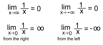 You can see that the full graph shows asymptotes in all four directions.The x and y axes (in green), which are the lines y = 0 and x = 0, become the asymptotes. Here are the limit statements: