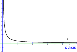 You can see the values of y getting smaller and smaller as x increases (direction of arrow); they are getting closer to zero, but will never get there. This type of behaviour is called asymptotic. The graph seems to be approaching the x axis (in red), which is the line with equation y = 0. The line y = 0, (in green) is called an asymptote. Looking again at the graph above you can see that the same behaviour seems to be happening close to x = 0. As x gets closer and closer to zero, from the right, the values of y are getting larger and larger. Since x can't be zero, the value there is also infinity. The y axis, or the vertical line x = 0, is also an asymptote. Remember that x can be any Real number, and both positive or negative. Let's return to the entire graph of y = 1/x. [You can see this on your Ti calculator:]
