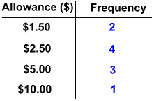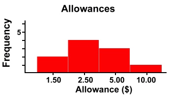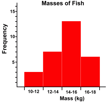 Bar graphs are used to represent the frequency of discrete items. They can be things, like colours, for which there is no particular order. Or they can be numbers, like allowance amounts, where they can be put into order if you choose to. But (this is the important part) the items are not grouped, and they are not continuous. We'll show you what we meant by that last sentence, in the example below, where we show you a set of data that we will group, and display in a continuous manner on a histogram. Suppose we were surveying the masses of fish in a lake, and we caught and weighed twenty-nine fish. We recorded their masses (in kilograms). Below is the data we might have collected. ![]() If you examine the data above closely, you'll see that there are a lot of mostly different numbers. It wouldn't make much sense to make a bar graph showing the frequency of each individual mass, since most of the bars would just be one ot two units high, and there would be a lot of bars. Instead we're going to group the data. Grouping means to count how many masses there are in different weight categories, or classes. For example, how many fish had a mass between 10 and 12 kilograms? The answer is three. They were 10, 11.4 and 11.8 kg. Note that we don't count 12 in this class of fish. We're defining 'Between 10 & 12 kilograms' to mean 'everything from 10 up to 12, but don't count 12' Below is our grouped frequency table. We've shown (on the left) which masses went into the count for each class. We also indicated the upper bound of each class in red, to remind you that this value isn't counted in that class. ![]() By grouping the data this way, we accomplish several things. First, there will be fewer bars on the graph, and the bars won't all be showing just one or two items. Second, we've made a continuous range of masses. all the way from 10 to 18 kilograms, and every possible mass we could obtain must fall somewhere in this range. Also, because each class runs right up to the next one without overlap and without leaving out any values, the bars must touch. Here's the histogram: ![]() This graph is a histogram, but not just because the bars touch. In the bar graph example at the top of the page, you saw that bars in a bar graph can touch if you want them to ... but they don't have to. Touching bars in a bar graph doesn't mean anything. In a histogram, however, the bars must touch. This is because the data elements we are recording are numbers that are grouped, and form a continuous range from left to right. There are no gaps in the numbers along the bottom axis; every possible fish mass can be located in one of the classes. This is what makes a histogram. ADDITIONAL NOTE: The material on this page follows the Alberta Junior High Math 8 curriculum. There are of course other ways to define and set up classes, and more rigorous definitions of histograms. |