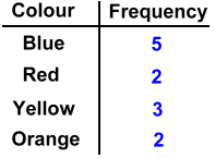 ![]() A bar graph shows you the frequency of each element in a set of data. The height of each bar represents how many of that data element there are. Here's an example. Suppose we bought a small box of Smarties and counted how many of each colour was in the box. We might get results as shown in the table below left. We could then record the frequency of each colour in a bar graph, as shown below right.