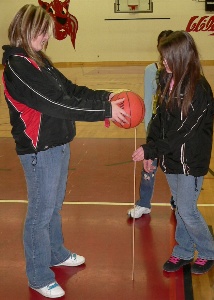 ![]() ![]() There are a variety of ways to measure a basketball's bounce; we'll show you one way here that uses nothing more complicated than a metre stick and the use of square roots and a calculator. In order to measure a ball's bounce, you must drop it from a measured distance, and then record the distance to which it rises after it bounces. Since the surface you bounce it on will also affect how high it bounces, you should do the test on a basketball court floor. We tested a variety of basketballs, some in good condition and some not so good. We'll show you how to make the calculation. First you must measure the distance that the ball falls. We'll call this the height down, or hdown. This is measured from the bottom of the basketball to the floor, as shown in the picture at the left below. Next, measure the distance that the ball rises after bouncing. We'll call this the height up, or hup. This is measured from the floor to the top of the basketball, as shown in the picture at the right below. (The person doing this had her hands ready to catch the ball at the top of its rise, to make measuring easier) ![]() ![]() Here's the formula for calculating the bounciness of the basketball. Bounciness is referred to as the coefficient of restitution, and we'll call it C. ![]() We did the experiment a number of times, on a variety of balls. Here is one result we got: for a drop of 100 cm, the ball bounced back up to 61 cm (measured to the top of the ball). Let's work out the coefficient of restitution for this ball: ![]() According to one source we found, an official basketball should have a coefficient of restitution of between 0.76 and 0.80, so the ball shown above was a good one. Surprisingly, some of the balls had a value of C that was higher than 0.80; we couldn't find an explanation for why a ball that is too bouncy could not be an official ball. ![]() ![]() ![]() |