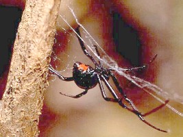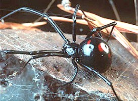 The Black Widow Spider is the common name for several related long-legged, smooth-bodied spiders that live in areas ranging from the Tropics, most of the United States, and as far north as Canada. The shiny black body and red hourglass shape on its abdomen are easily recognizable characteristics of the Black Widow female; the smaller males are a dull brown, and harmless. Black Widow females spin irregular webs in crevices and other dark, protected spots, especially in wood piles, under the eaves of