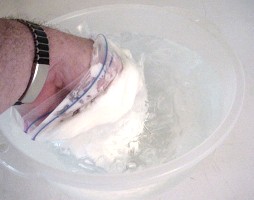 ![]() Polar bears, whales, seals, and other arctic creatures have a layer of fat under their skin that helps keep their heat in when it's cold, and especially when they dive into water that's just above 0° C. This layer of fat is called blubber. Here's a simple experiment you can try, that will show you that blubber really can keep you warm. Put your hand into the bowl of ice-cold water. How long can you keep it there? If you had to swim in this water, all the heat from your body would escape into the water and you would quickly freeze to death. So would a polar bear. Let's see if blubber helps. Spoon almost a full package of the lard into one of the sandwich bags. This lard is very similar in composition to the fat under an arctic animal's skin. In fact, animal blubber can be eaten, cooked with, and even burned in oil lamps. Inuit peoples in the north used it to help survive the cold weather. Place your hand inside the second empty sandwich bag. This is just to keep your hand clean, and to keep the lard clean as well, so that it can be put back in the box and used again. If you don't mind getting messy, and don't plan to reuse the lard, skip this step. We couldn't find large sandwich bags, so it was a tight fit. Try to use bags that will fit your hand. Move the lard around so your hand is buried on all sides. Amazing, isn't it? Your hand stays warm. You can't feel the cold at all! You could leave your hand immersed in the water for a long time, and it would never get cold! This is how seals, polar bears, and whales can swim in ice-cold water and not freeze to death. The layer of fat, called blubber, under their skin, keeps the heat in. They don't feel the cold at all! Now you know how blubber works! |