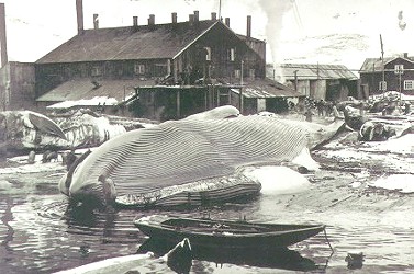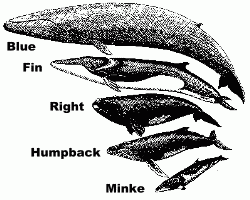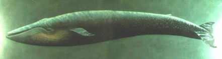 Balaenoptera musculus Blue whales are the largest animals to have ever existed .... larger even than the biggest dinosaur. Some have been as long as 33 metres (110 feet), but most are in the 24-27 metre range. Blue whales can weigh up to 110 tonnes (120 tons). They have a life expectancy of 35-40 years. Blue whales are bluish-grey in colour, and their underside is slightly lighter. Blue whales feed on tiny organisms called krill. Krill are tiny shrimp that live in large schools in almost every ocean of the world. They are one of the most plentiful food species (except for insects) on earth. The baleen in the whale's throat filters out krill by the thousands. Small fish and plankton are also caught by the baleen. It may take as much as 3500 kg of krill and small fish a day to keep the Blue whale healthy. ![]() Blue whales are fast swimmers, able to reach speeds of 30 km/h if chased. Whales are mammals, and must surface to breathe, but they can hold their breath a long time ... dives can last anywhere up to 20 minutes. Blue whales also make very loud sounds. The low-frequency sounds they make when they communicate with each other have been recorded as loud as 188 decibels, and can be heard as far as 800 km away. (For comparison, a commercial jet taking off makes a sound of 120 db). Learn more about sound, and hear a blue whale here. The buoyant force of water in the whale's ocean environment is one reason that it can grow so large. Instead of relying on just a skeleton to support its weight, the buoyancy of the surrounding ocean water supports the whale's body tissues. If a Blue whale were to be removed from the ocean, it would be crushed to death by its own weight. Packs of Killer whales have been known to attack and kill young Blue whales, but the Blue whale's main predator has been man. Blue whales were hunted nearly to extinction, until the International Whaling Commission declared them to be a protected species in 1966, because of the huge decrease in their population. Blue whales comprised about 90 percent of the whaling industry’s total catch during the early part of the twentieth century; in 1931, more than 30,000 were killed, for their blubber, flesh, bones, and body oils . Today it is believed that about 11,000 still exist.