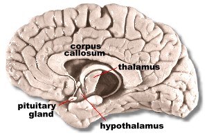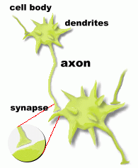 Your brain is pinkish-grey on the outside, and covered in folds. Inside, it is a very light shade of yellow. Brain matter is very soft, so it needs to be protected by tissues and liquid that surround it (not visible in our photographs), and the bony skull. The brain has three main parts. The largest is the cerebrum, at the top. The convoluted surface of the cerebrum is called the cerebral cortex, which is only about a third of a cm thick, but this is the part that does the thinking and understanding ... it enables you to learn, remember, and reason. Your cerebrum is actually divided into two halves, called the right and left hemispheres. Each half of the cerebrum is responsible for different tasks. Information is shared between the halves by way of the corpus callosum. It automatically coordinates all of your limb and muscle movements, to help you sit, walk and balance. OCCIPITAL LOBE: This part of the brain processes what your eyes see, and turns it into a picture of the world around you. PARIETAL LOBE: It controls the sense of touch, and how you use your hands to do things. CEREBRUM: This is the top of the brain, covered by the cerebral cortex, which contains your memories and language, and correlates information received from your senses. It controls voluntary movement, emotions, and does the thinking. FRONTAL LOBE: This part of the brain controls your ability to speak. TEMPORAL LOBE: This is where signals from our ears are processed, so we can hear. PONS: Breathing, the regular beating of the heart, and other involuntary activities of the body (the ones that happen without you having to think about it) are contolled here. BRAIN STEM: This collects all the body-controlling messages from the brain, and passes them on to the rest of the body. Let's look at a brain which has been split in half vertically, so we can identify more structures: THALAMUS: The thalamus relays incoming messages from your senses to the proper areas of the brain that need to process them. HYPOTHALAMUS and PITUITARY GLAND: Together these help regulate sexual urges, body temperature, growth, thirst and hunger, maternal behavior (including milk production in mammals), aggression, pleasure, and your 'biological clock', which lets you know when you need to sleep or wake up. CORPUS CALLOSUM: This portion of the brain is the connection between the two halves of the brain (the right and left hemispheres). ![]() (Our simplified diagram at the left shows only a few connections). The information is actually passed from each axon to a dendrite across a gap called a synapse. The electrical signals trigger neurotransmitters, which are chemicals that move across the gap and stimulate the dendrite, conveying a message from one neuron to another. Every time your brain does something ... think, feel sad, send a signal to move your arm or take a breath ... millions of neurons are sending messages to and from one another. The messages consist of electrical impulses sent down the axons, and chemical messages moving across the synapses. Neurons have different shapes, depending on the job they do. But all neurons share the capability of linking with others in order to pass electrical and chemical messages. As you learn things ... like how to throw a baseball, or how to interpret a poem, or how to factor a polynomial ... your neurons grow more dendrites to become attached to other neurons. The more you repeat that learning, or practice what you've learned, the stronger these connections between neurons become. There are over 100,000,000,000,000 possible connections between neurons in the brain, which makes the human brain more powerful than any computer ever made. The size of the average human brain isn't much bigger than two adult fists side by side. Smarter people don't have bigger brains, just more connections between neurons. There is some evidence to suggest that the interior structure of a very smart person's brain may be slightly different than normal, however, based on measurements made on Albert Einstein's brain after his death.