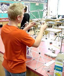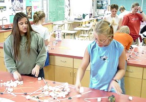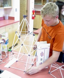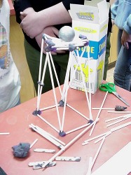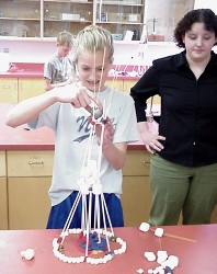 ![]() Science 7 & 8 classes tried building bridges and towers from spaghetti, straws, plasticene, and marshmallows. Here are a few of their designs. Some were more successful than others. The class discovered that soft marshmallows don't work well with large structures ... the straws weren't held firmly enough to prevent sideways motion. Similarly, long pieces of spaghetti tended to flex too much. Only the best designs using marshmallows or spaghetti avoided tipping. Plasticene worked well as a connector, and provided good lateral (shear) strength Some structures disintegrated in spectacular fashion.