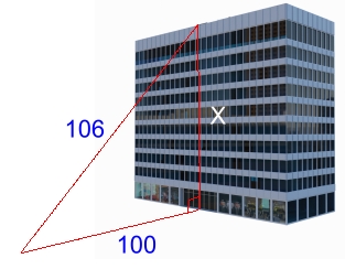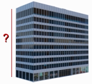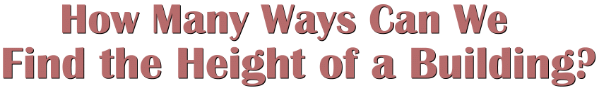 Here's the problem. There is an office building that we'd like to find the height of. We know it's ten stories high, and we have access to the building, including the roof. All equipment needed is available.The goal is to find as many ways as we can to determine the height of the building. We came up with seventeen methods. Here they are, in no particular order. NOTE: The measurements we're using will be chosen for convenience; actual measurements would work exactly the same, regardless of their size. Also, for some of the methods, we can assume that the height of the angle-measuring instrument was taken into account. Method 1: Trigonometry from the ground