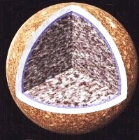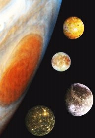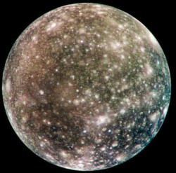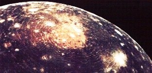 Callisto is the eighth of Jupiter's moons, and its second largest, with a diameter of 4800 km. Callisto's surface is completely covered with craters, and is very old, like the highlands of the Moon, and parts of Mars. In fact, Callisto has the oldest, most cratered surface of any body yet discovered in the solar system, having changed little, except for scattered meteorite impacts, in the 4 billion years since the solar system was formed. Callisto orbits just beyond Jupiter's main radiation belt. The Galilean moons are also Jupiter's four largest moons, and can be seen, top to bottom, in the order of their distance from Jupiter, against the backdrop of the giant planet, in the picture at the right. They are Io, Europa, Ganymede and the furthest, Callisto. These moons are very large. The smallest of these, Europa, is the size of Earth's moon. Ganymede is the largest moon in the solar system. In fact, Ganymede with a diameter of almost 5000 kilometres is larger than the planets Mercury and Pluto! Jupiter's Great Red Spot appears in the background. This huge storm system (two to three Earths could fit inside it) has been raging in Jupiter's atmosphere for over 300 years. These photos were taken by the Voyager spacecraft in 1979 and by Galileo, which began exploring the Jovian system in 1995. There is little evidence of tectonic activity on Callisto. This has puzzled scientists, since Callisto is very similar in makeup to Ganymede, but the latter moon seems to have a lot of activity under its surface. However, like Ganymede, Callisto's oldest craters have disappeared, or collapsed. There are no high crater-ring mountains or deep central depressions as there are in craters on the Moon and Mercury. Callisto may have a very thin atmosphere, perhaps composed of carbon dioxide. The spacecraft Galileo has also detected evidence of a weak magnetic field, which seems to indicate some sort of 'salty fluid' below the surface. Callisto has a low density (1.86 gm/cm3). It appears to be composed of a crust about 200 kilometers thick. Beneath the crust it is suggested that there may be a salty ocean layer that is more than 10 kilometers thick. Beneath that underground ocean layer, the interior seems to be composed of compressed rock and ice, with the proportion of rock increasing towards the centre. Callisto is about Meteorites have punctured holes in Callisto's crust, causing water to spread over the surface, and forming bright rays and rings around the craters. The idea that there may be water below Callisto's crust is explained by Dr. Margaret Kivelson, space physics professor at the University of California at Los Angeles. "The premise of an ocean came from studying the magnetic fields around Jupiter and its moons. It was found that Callisto's magnetic field varies (flows in various directions at different times) in response to the background magnetic field generated by Jupiter. The new Galileo data certainly suggest that something is hidden below Callisto's surface, and that something may very well be a salty ocean". The largest craters on Callisto are surrounded by concentric rings which look like huge cracks, and which have been smoothed out by billions of years of slow movement of ice. The largest of these has been named Valhalla (left). It has a bright central region that is 600 kilometers in diameter, and the entire crater is nearly 3000 km across. Valhalla is the result of a massive impact by a meteorite or small asteroid. (Another example is Caloris Basin on Mercury). Photos and some information from NASA Picture of the Day, as well as the excellent Views of the Solar System |